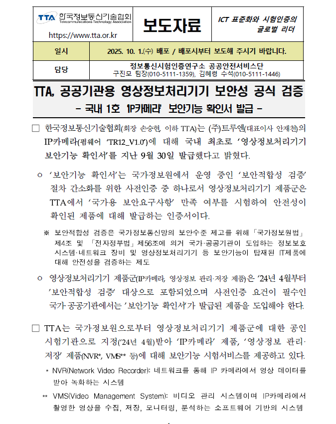 □ 한국정보통신기술협회(회장 손승현, 이하 TTA)는 (주)트루엔(대표이사 안재천)의 IP카메라(펌웨어 ‘TR12_V1.0’)에 대해 국내 최초로 ‘영상정보처리기기 보안기능 확인서’를 지난 9월 30일 발급했다고 밝혔다.